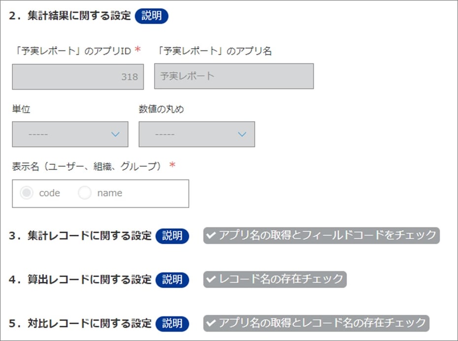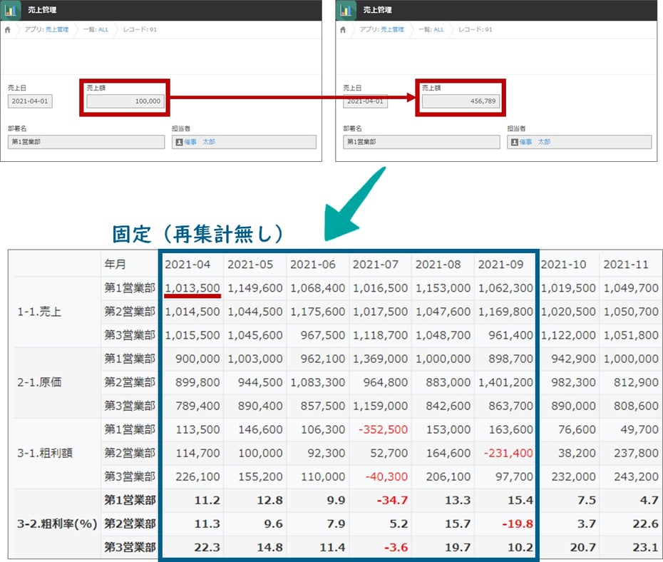 以後、「集計実行」ボタンをクリックしても、「レポート開始日」~「固定集計期間」の値は確定している為、売上アプリ等の集計元アプリの値を変更しても、再集計されません。