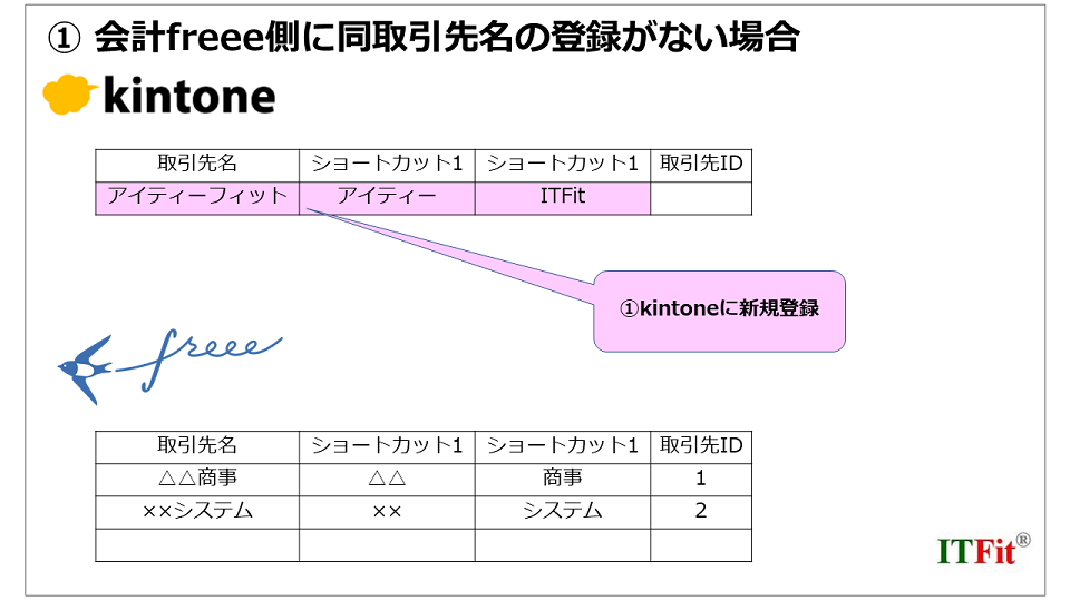 - kintone側に会計freee側と同名の取引先名が存在する場合:会計freee側から取得した取引先名等を