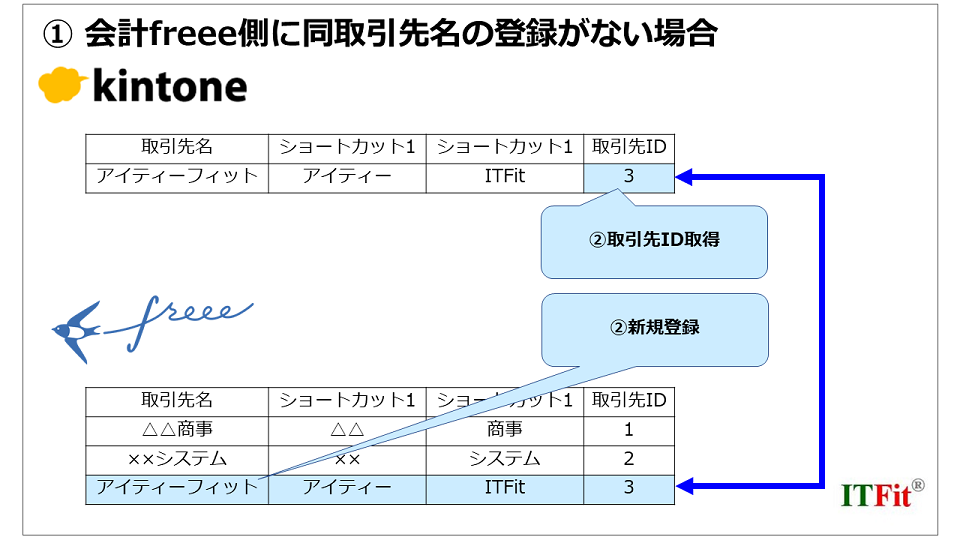 - kintone側の取引先IDが空欄の場合:会計freeeに新規取引先を登録。
